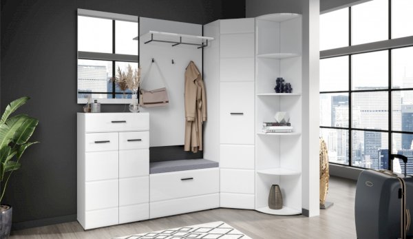 Прихожая Йорк выполнена в современном стиле – сочетает в себе функциональность и эффектный внешний вид: строгая горизонтальная фрезеровка фасадов, контрастные черного цвета ручки и задняя стенка из ХДФ. Глянцевые белые фасады High Gloss из МДФ и зеркала наполняют помещение светом, делают ее ярче и просторнее. Компактная и вместительная, с небольшой глубиной модулей, она поможет правильно организовать систему хранения даже в небольшом помещении.