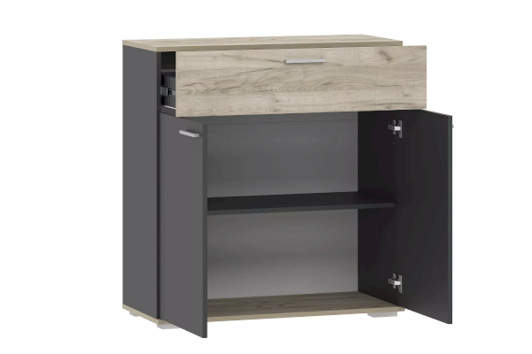 Тумба оснащена выдвижным ящиком со встроенной перегородкой, который выдвигается плавно и бесшумно благодаря шариковым направляющим, а лаконичные ручки серого цвета подчеркивают стиль коллекции. За распашными дверьми - две полки, на которых удобно расположить все необходимые вещи. Дополните тумбу шкафом из одноименной коллекции, чтобы создать особо гармоничную атмосферу.