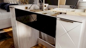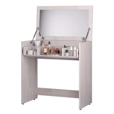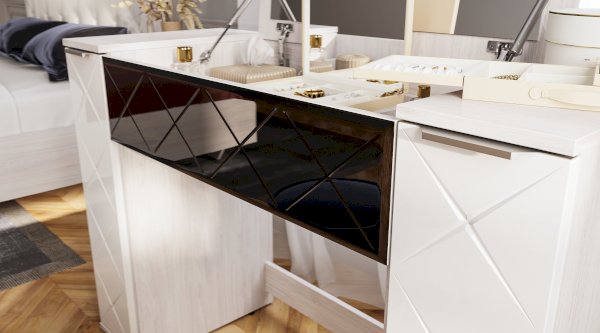 Компактная модель косметического стола Кимберли поможет вам разметить все необходимые средства по уходу за собой. При этом они будут не на виду, а спрятаны под откидной крышкой, в которое встроено зеркало. Выдвижной ящик с красивым черным фасадом из крашеного стекла разделен на несколько секций, чтобы в вашем столике всегда был порядок. В закрытом положении модель Кимберли может использоваться как письменный стол.