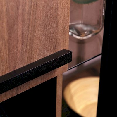 Благородный древесный оттенок шкафа, контрастирующий с черными ручками из массива дерева, подойдет к большинству цветовых решений – мебель будет легко комбинировать с другими предметами. Высокий шкаф МЦН удобен своей функциональностью и эргономичностью конструкции. На открытой полке разместите фотографии или элементы декора, а за глухими фасадами спрячьте документы и ценные вещи от посторонних глаз. Регулируемые опоры шкафа позволят компенсировать незначительные неровности пола.