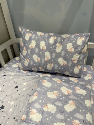 Милые овечки будут оберегать сон ребёнка и сделают процесс засыпания быстрым, а сон крепким. Идеальный комплект как для мальчика так и для девочки.