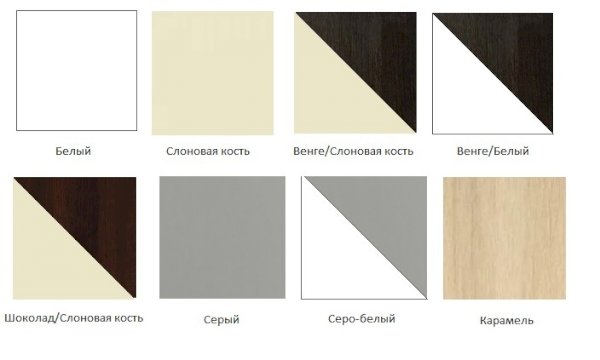 Возможные цвета кроваток: белый, слоновая кость, венге/слоновая кость, венге/белый, шоколад/слоновая кость, серый, серо-белый, карамель