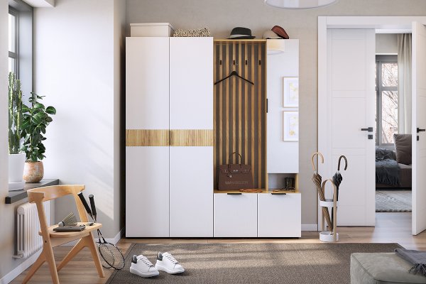 Шкаф 2-х дверный "Бери"-  это отличный вариант для маленькой прихожей. Выдвижная штанга для одежды, 5 полок, все это позволит разместить все необходимые вещи в прихожей.