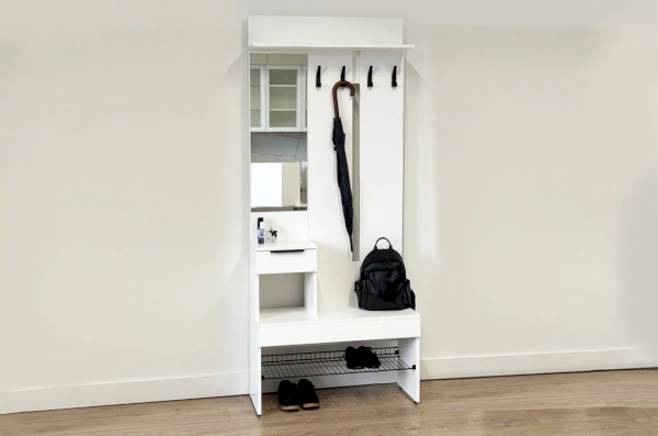 Крючки для одежды обеспечивают удобное место для размещения верхней одежды и аксессуаров, а выкатной ящик предоставляет дополнительное пространство для хранения мелочей. Сетчатая полка для обуви позволяет аккуратно разместить обувь, обеспечивая вентиляцию и легкий доступ.
