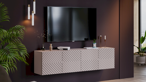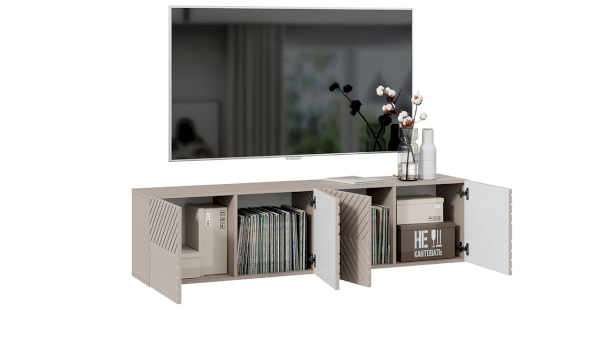 Тумба под ТВ обладает геометрическим силуэтом и привлекательной цветовой палитрой, превращая новинку в стильный модуль, который прекрасно дополнит современный интерьер гостиной.