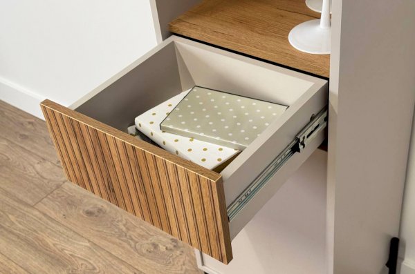 Особенностью стеллажа "Доминика" является выкатной ящик, который обеспечивает дополнительное пространство для хранения. Фасад ящика украшен декоративным элементом в цвете "дуб крафт золотой", придающим стеллажу элегантный и роскошный вид.