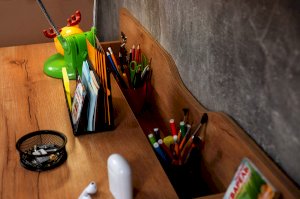 Стол отличается нестандартным решением для столешницы, которая максимально адаптирована для потребностей современных детей и работе на компьютере. Под откидной её частью, открывающейся за плавный вырез, прячется ниша для хранения и отверстие для вывода проводов, чтобы они не запутывались и не мешали ребенку.