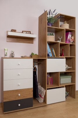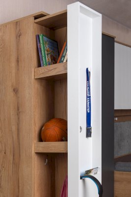 Подростковая кровать-тахта с большим выкатным ящиком на роликах, который можно использовать как место для хранения или как дополнительное спальное место. Он открывается за ручку-карман. Такой импровизированный карман дает возможность аккуратно сложить необходимые перед сном вещи: книгу, телефон, любимую игрушку.