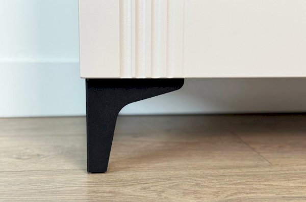 Корпус шкафа изготовлен из ЛДСП, что гарантирует прочность и долговечность. Фасад, покрытый МДФ в плёнке ПВХ, не только выглядит эстетично, но и защищает шкаф от повреждений. Особое внимание заслуживает фрезеровка фасадов, которая придаёт шкафу изысканный вид.