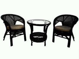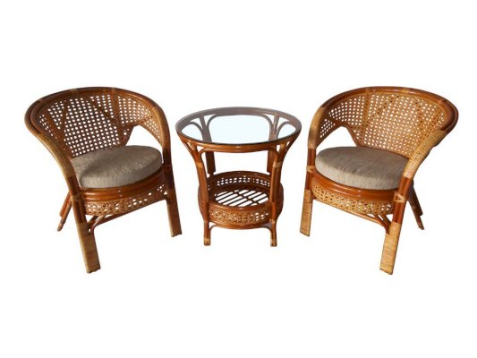 Комплект мебели Пеланги 02/15 включает в себя: 2 кресла и столик с красивым плетением снизу и полочкой, съемные подушки из материала улучшенного качества.